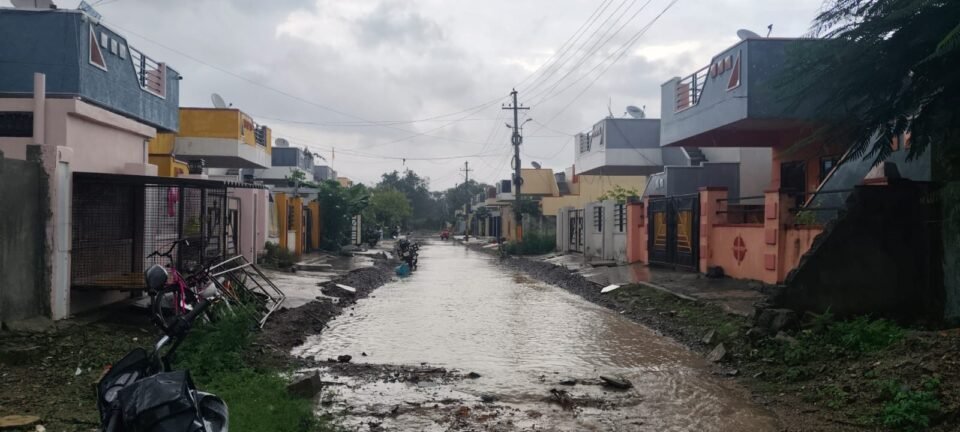 – సిసి రోడ్డు కోసం త్రవ్విన కాలనీ రోడ్డులో వరద ప్రవాహం.