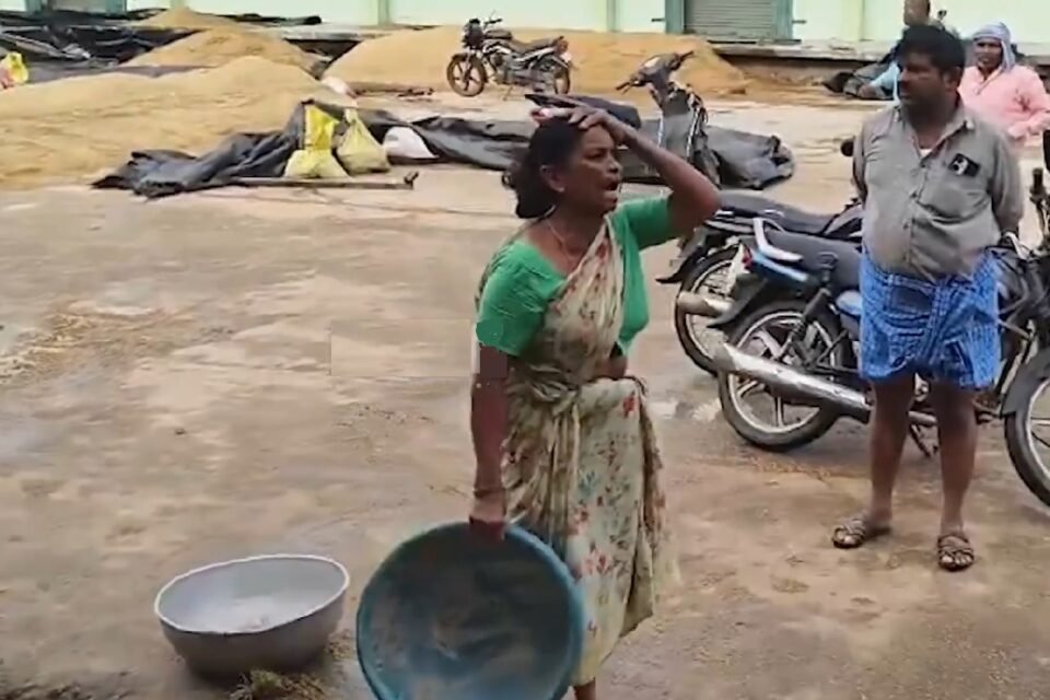 డ్రైనేజీ పాలైన ధాన్యం.. గుండెలు బాదుకుంటూ ఏడుస్తున్న మహిళా రైతు..